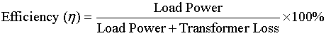 The efficiency of the transformer is defined as the power it can deliver to the load as a percentage of the total power drawn from the supply i.e. the load power plus the transformer losses. The efficiency is usually expressed as a percentage